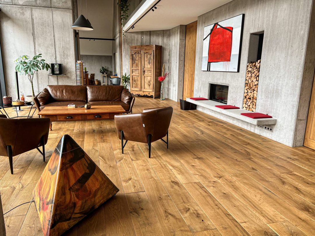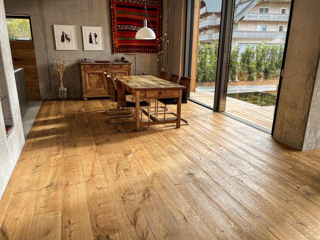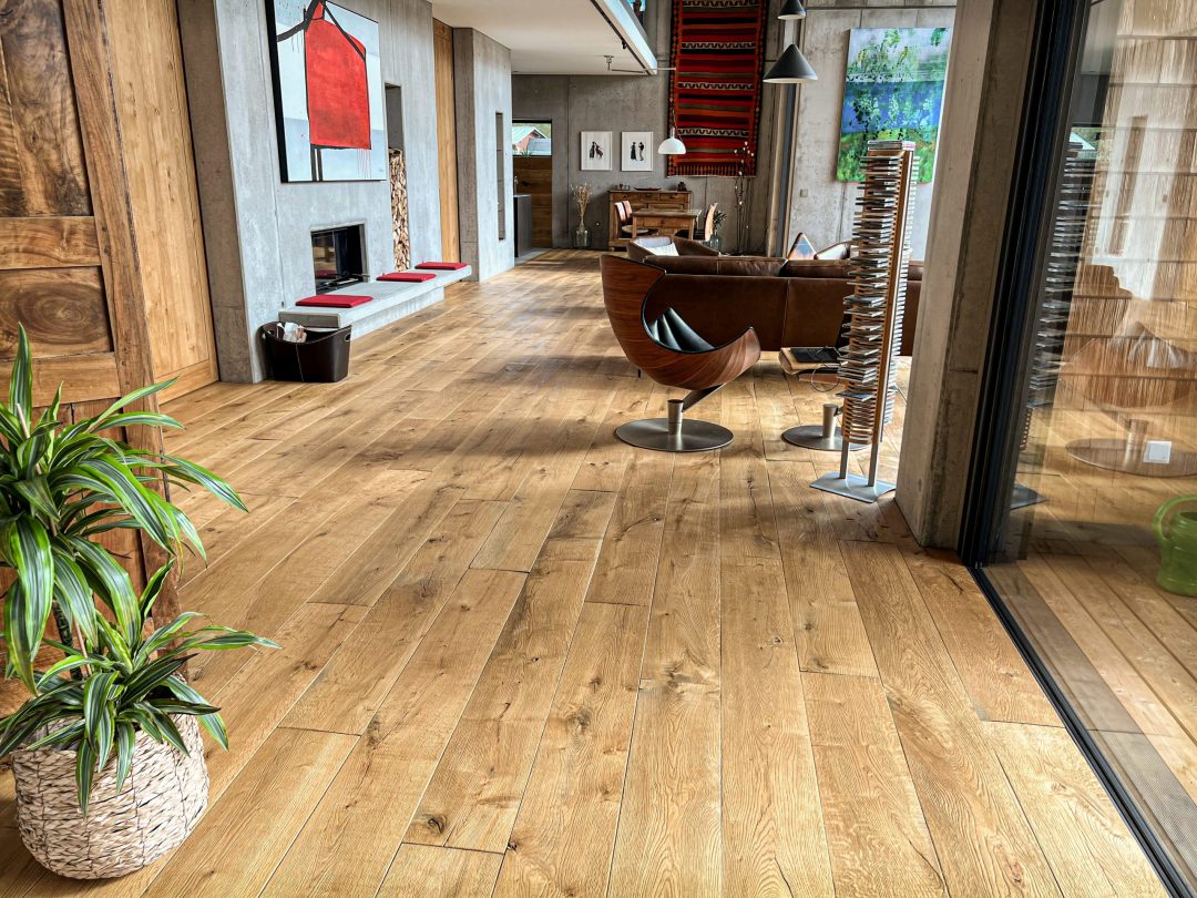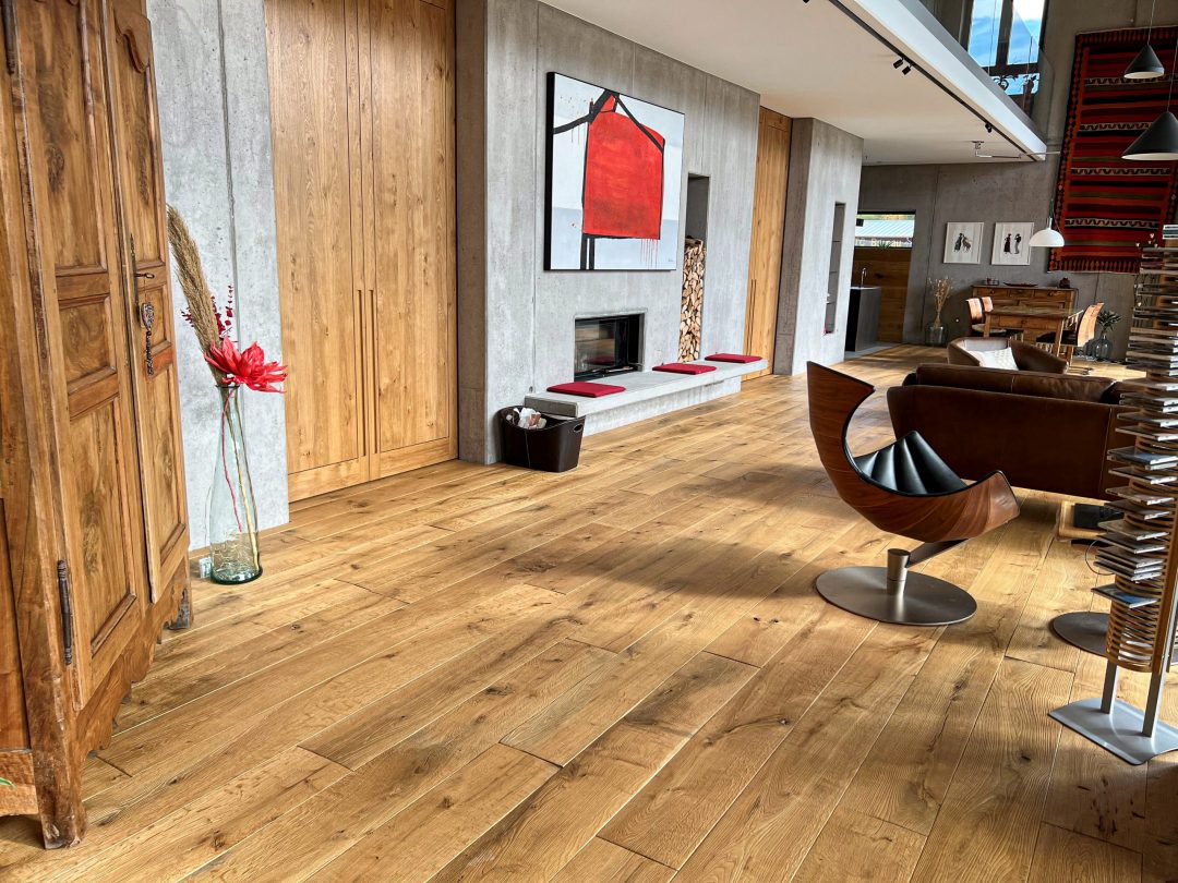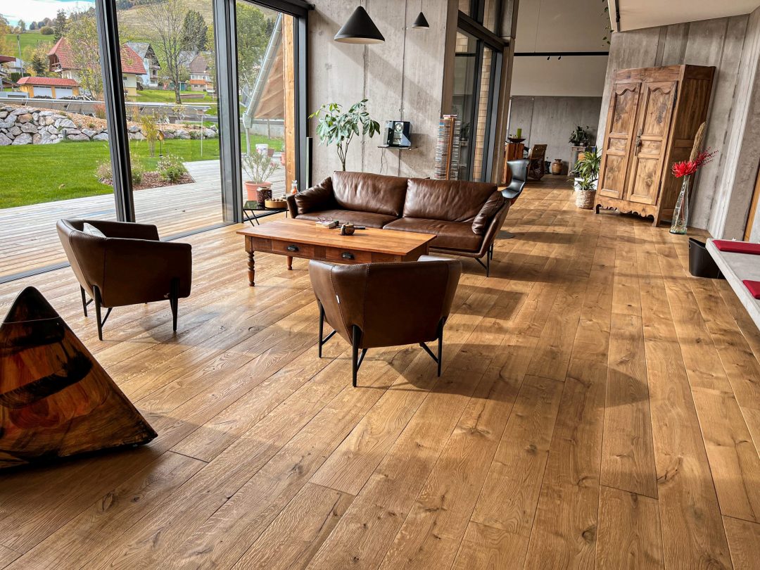 Angenehm gehen wie in der Natur. Die Chalet-Diele ist gekennzeichnet durch die natürlichen Unebenheiten auf der Oberfläche. Ein angenehmer und gesunder Fußschmeichler- Boden für Barfußläufer. Er stimuliert ihre Füße ähnlich wie bei einer Massage oder wie bei barfuß laufen in freier Natur. Ihre Füße und ihr Rücken werden Ihnen dankbar sein. Ein ebenso charakteristisches Merkmal der Chalet-Diele sind auch die nicht gespachtelten, beziehungsweise geschlossenen natürlichen Äste und Risse des Eichenholzes. Der Chalet- Boden geht auch eine überzeugende Symbiose mit top moderner Bauweise und Einrichtung ein. Überzeugen Sie sich gerne selbst beim Probelaufen in unserer Ausstellung zwischen Baden-Baden und Freiburg, oder auf einer Musterfläche bei Ihnen zu Hause, gebracht durch unsere „Rollende Ausstellung“. Die Chalet- Böden stellen wir in vielen Farben für unsere Kunden her.