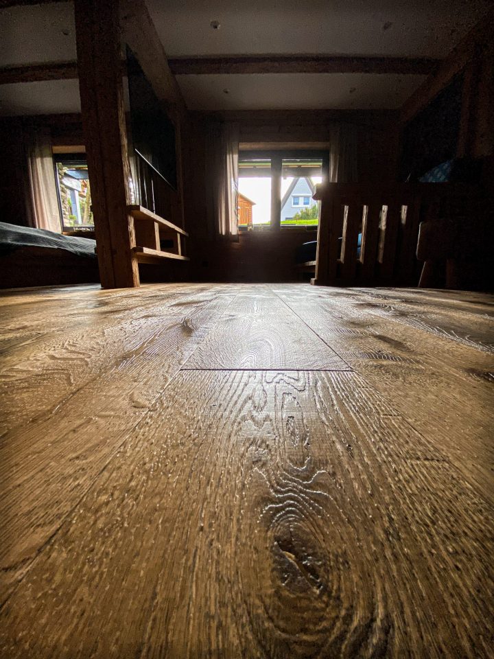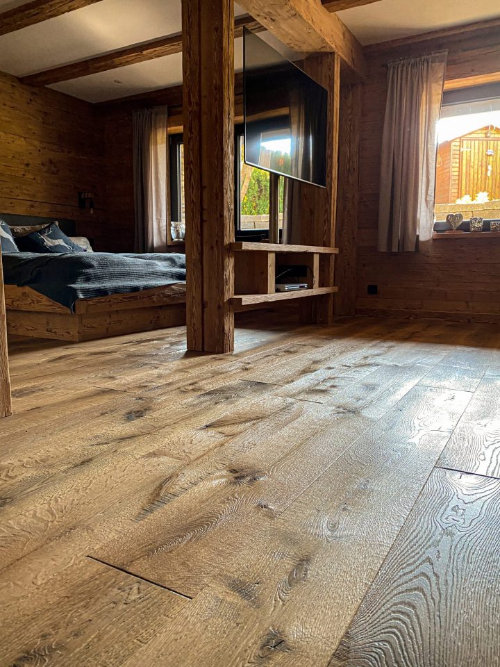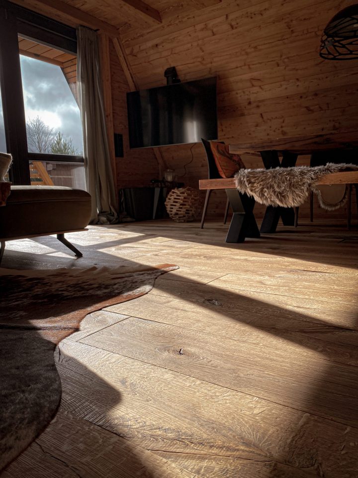 Le parquet Chalet se caractérise par les irrégularités naturelles de sa surface. Il stimule vos pieds comme lors d’un massage ou si vous marchiez pieds nus dans la nature. Les noeuds et fissures naturels sont préservés, afin de valoriser l’esthétique naturelle du chêne. Le parquet Chalet peut également offrir un contraste unique dans un aménagement moderne.
